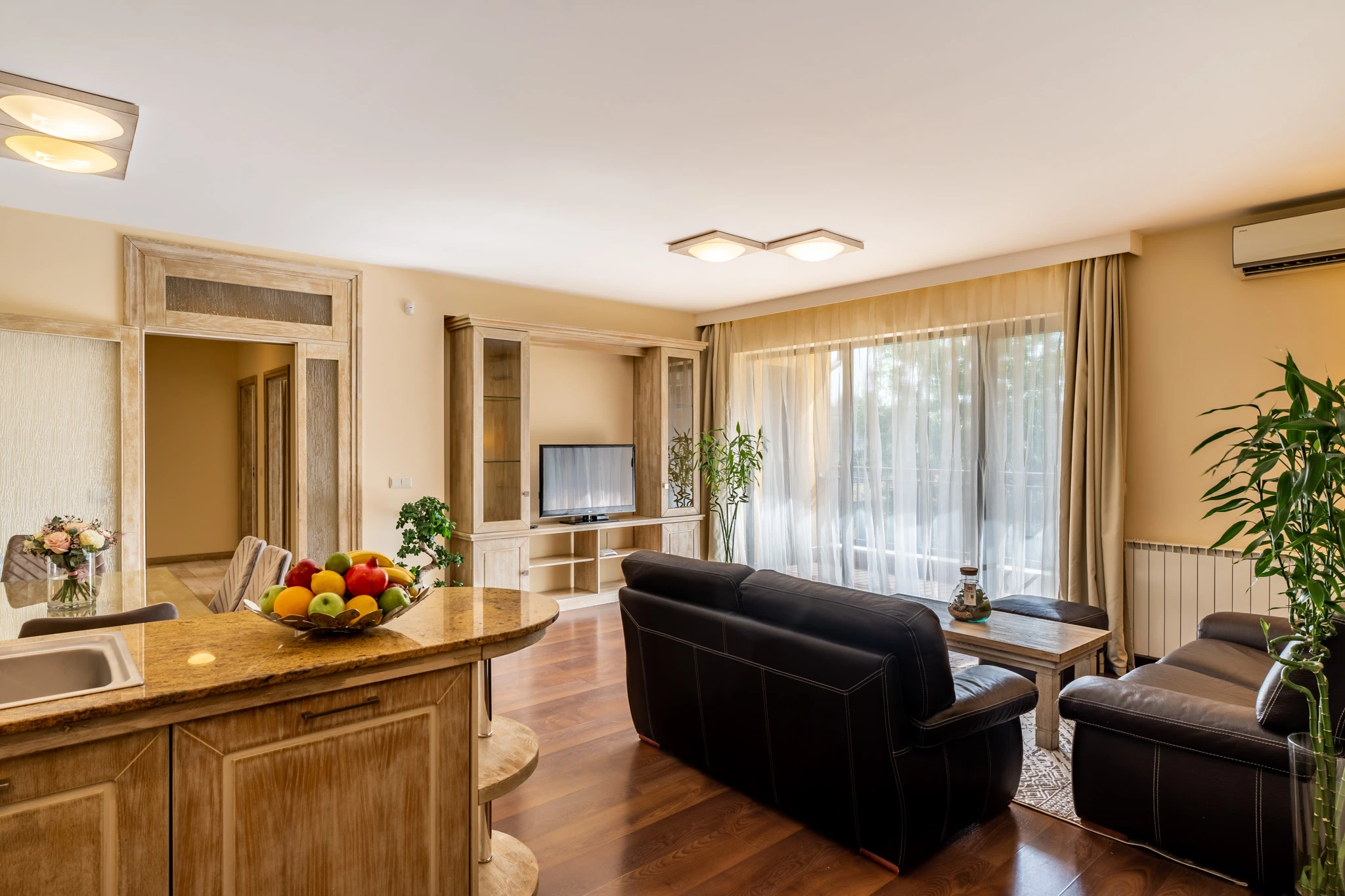Уютен и напълно обзаведен апартамент с три спални, три бани и самостоятелно перално помещение. Дневната зона е светла и приветлива, с отворено пространство за трапезария и всекидневна, и директен излаз към тераса с изглед към зеленина. Кухнята е оборудвана с електроуреди, гранитен плот и практични шкафове.