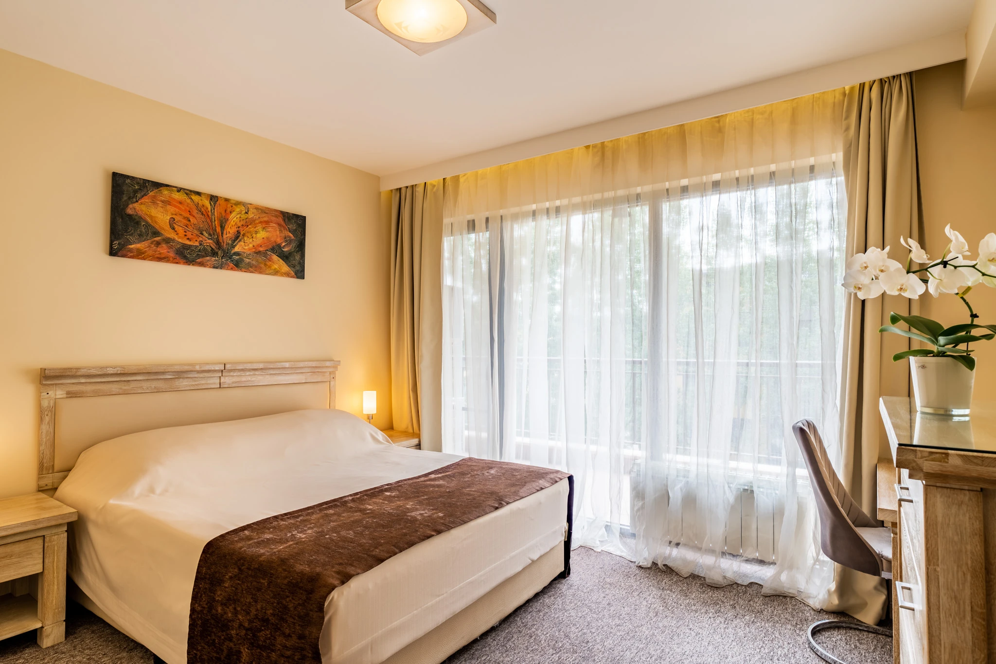 Each bedroom features large windows, cozy finishes, and built-in storage, while the bathrooms are designed in soft beige marble tones.